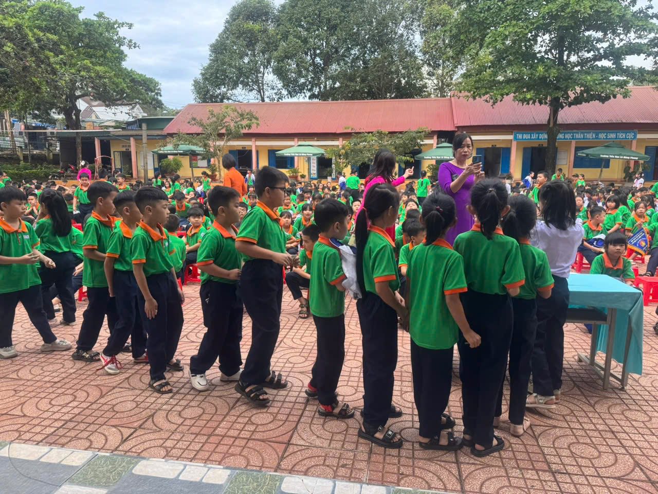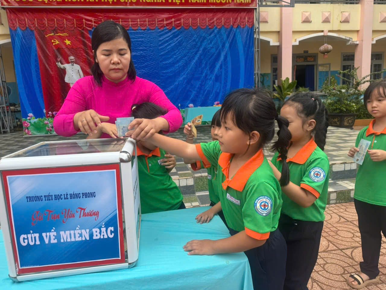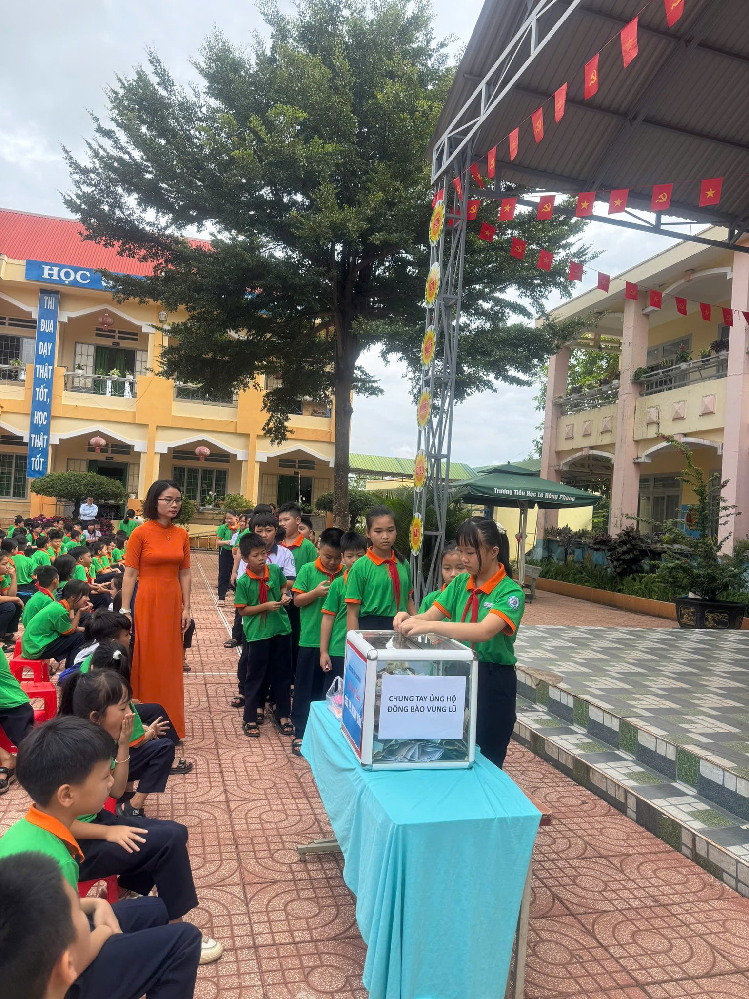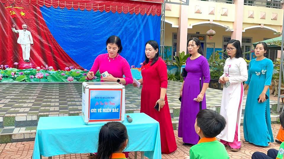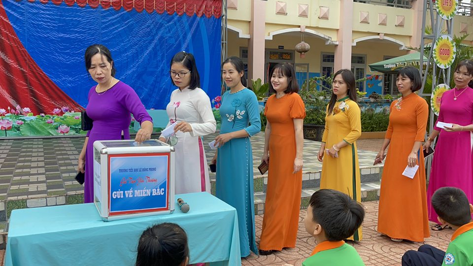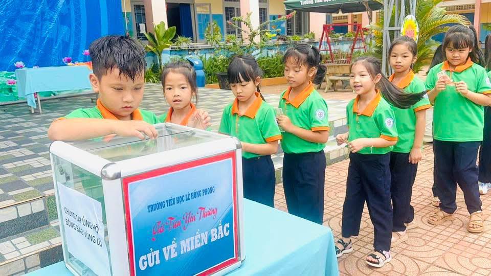 Thầy và trò trường Tiểu học Lê Hồng Phong, phường Bắc Gia Nghĩa, tỉnh Lâm Đồng quyên góp ủng hộ đồng bào Miền Bắc khắc phục bão số 10