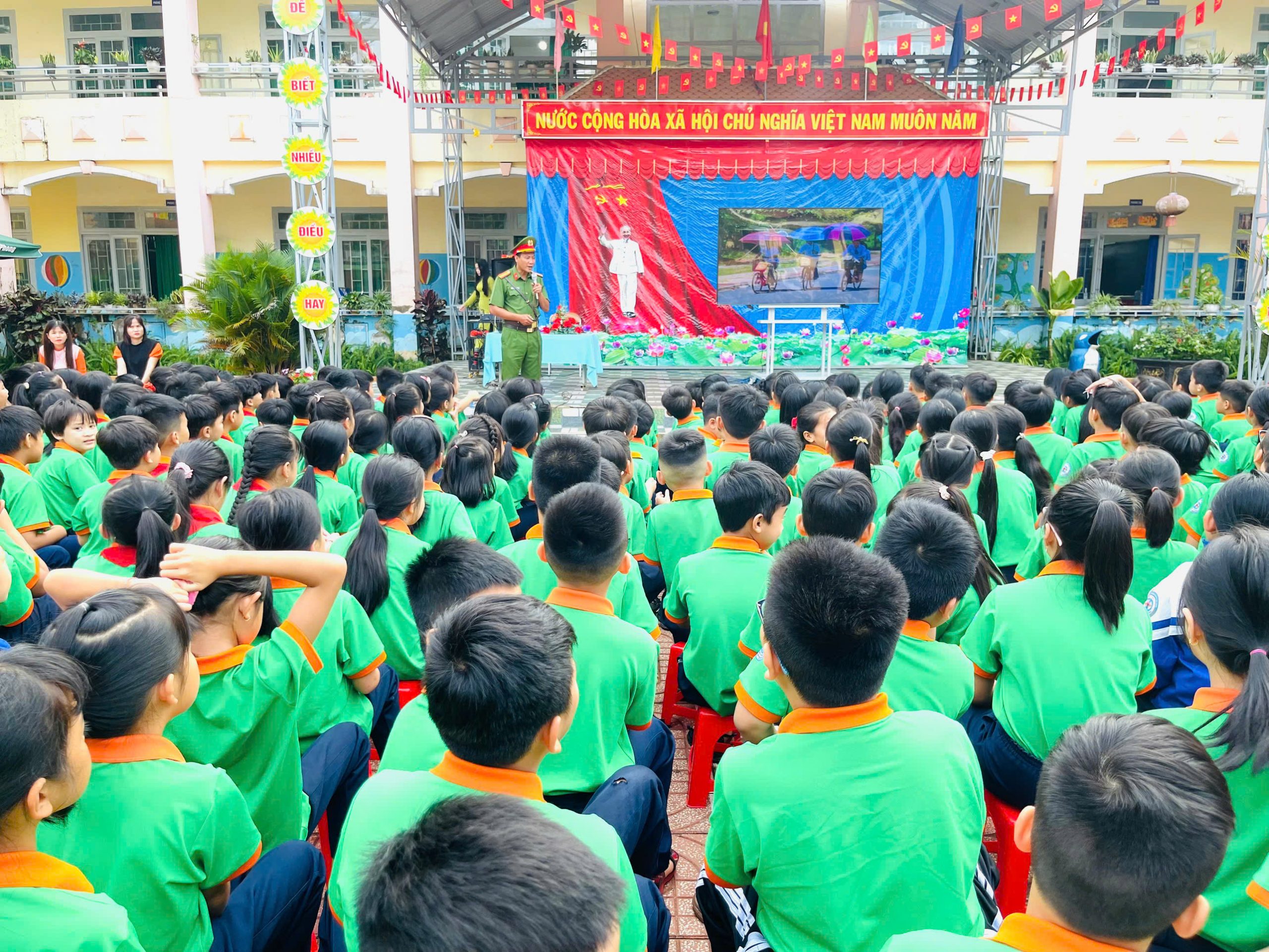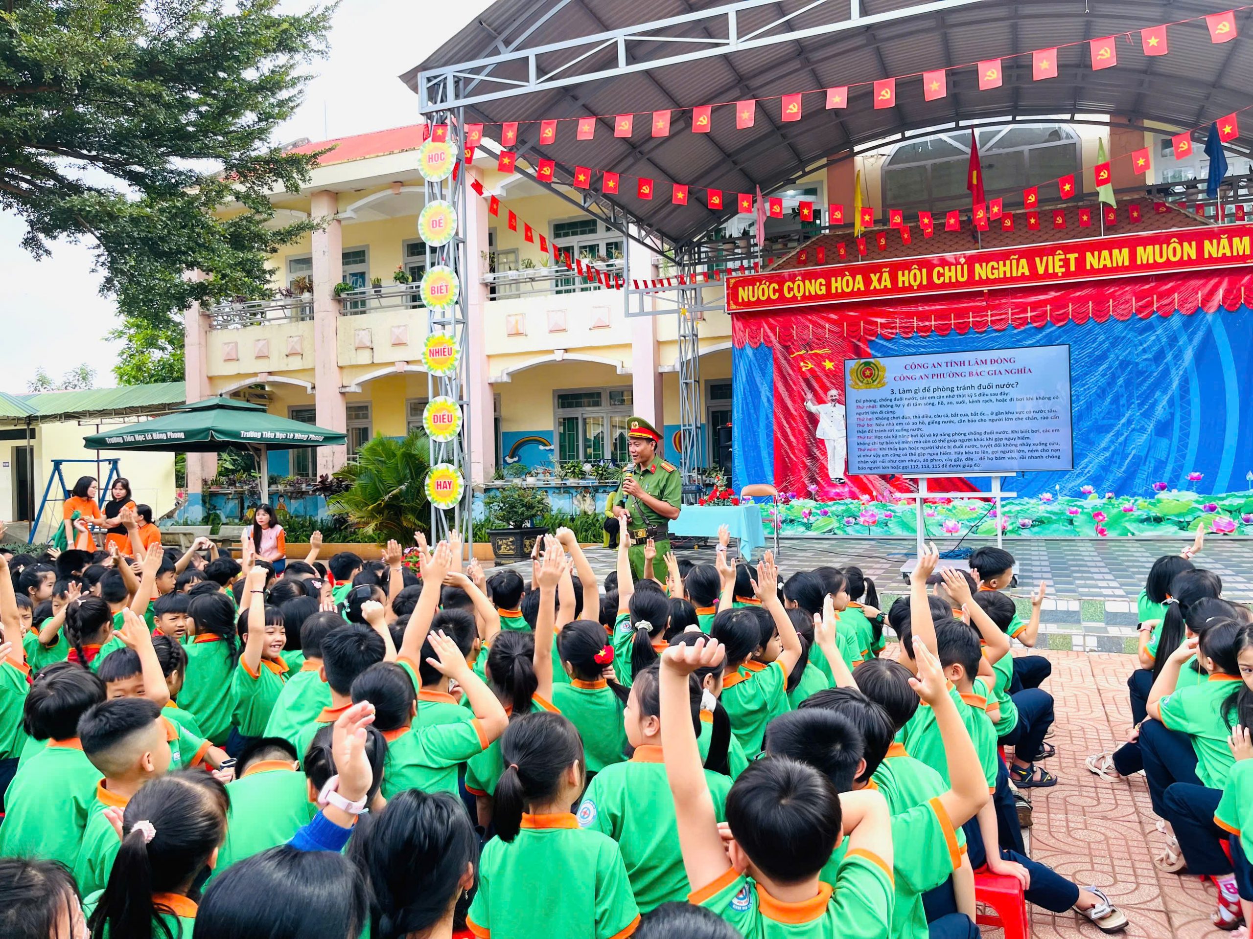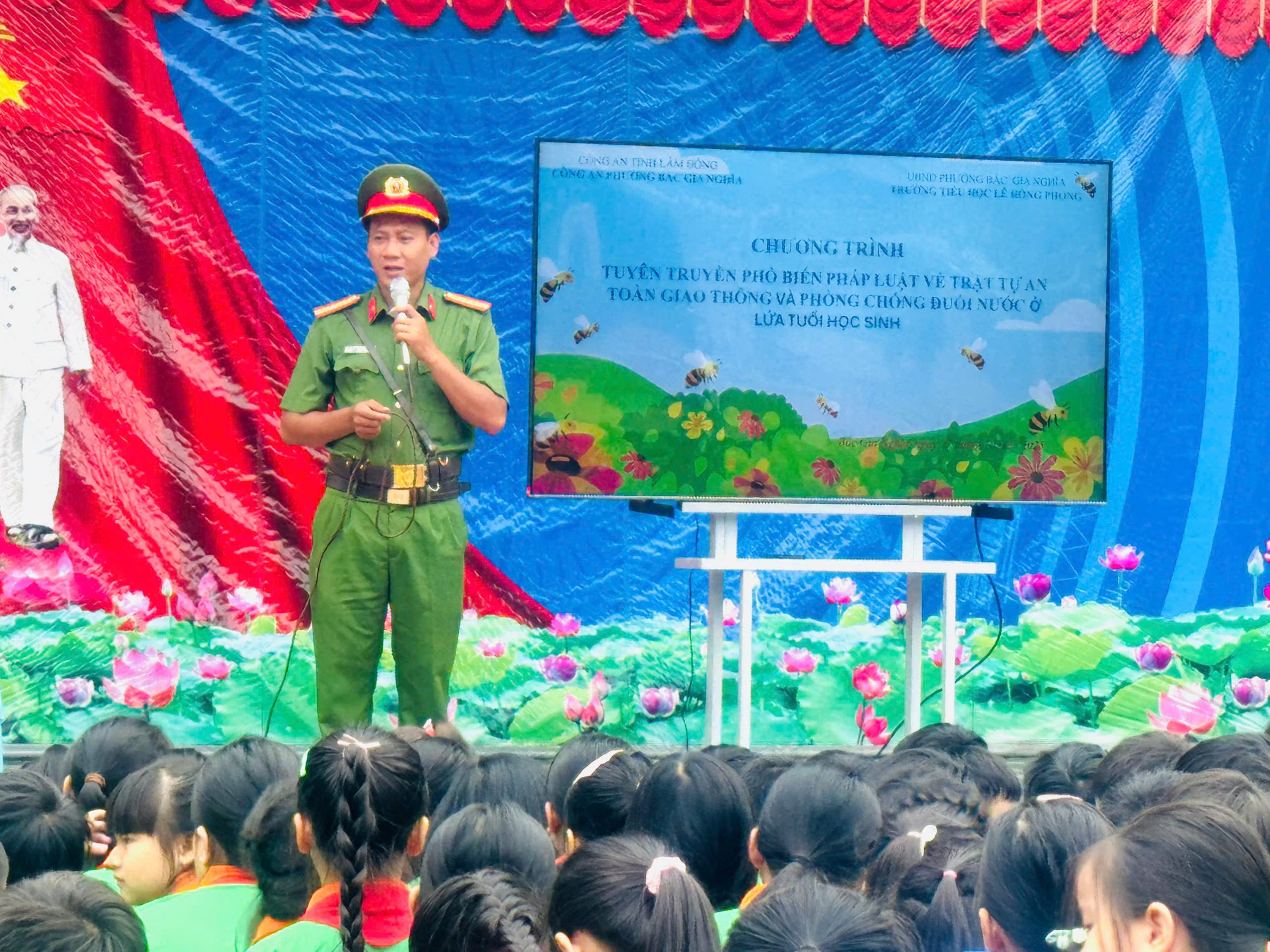 Sáng thứ 2, ngày 27/10/2025, trong giờ chào cờ đầu tuần, trường Tiểu học Lê Hồng Phong phối hợp với Công an phường Bắc Gia Nghĩa tổ chức tuyên truyền phổ biến pháp luật về trật tự an toàn giao thông, phòng chống đuối nước và an toàn thông tin trên không gian mạng.