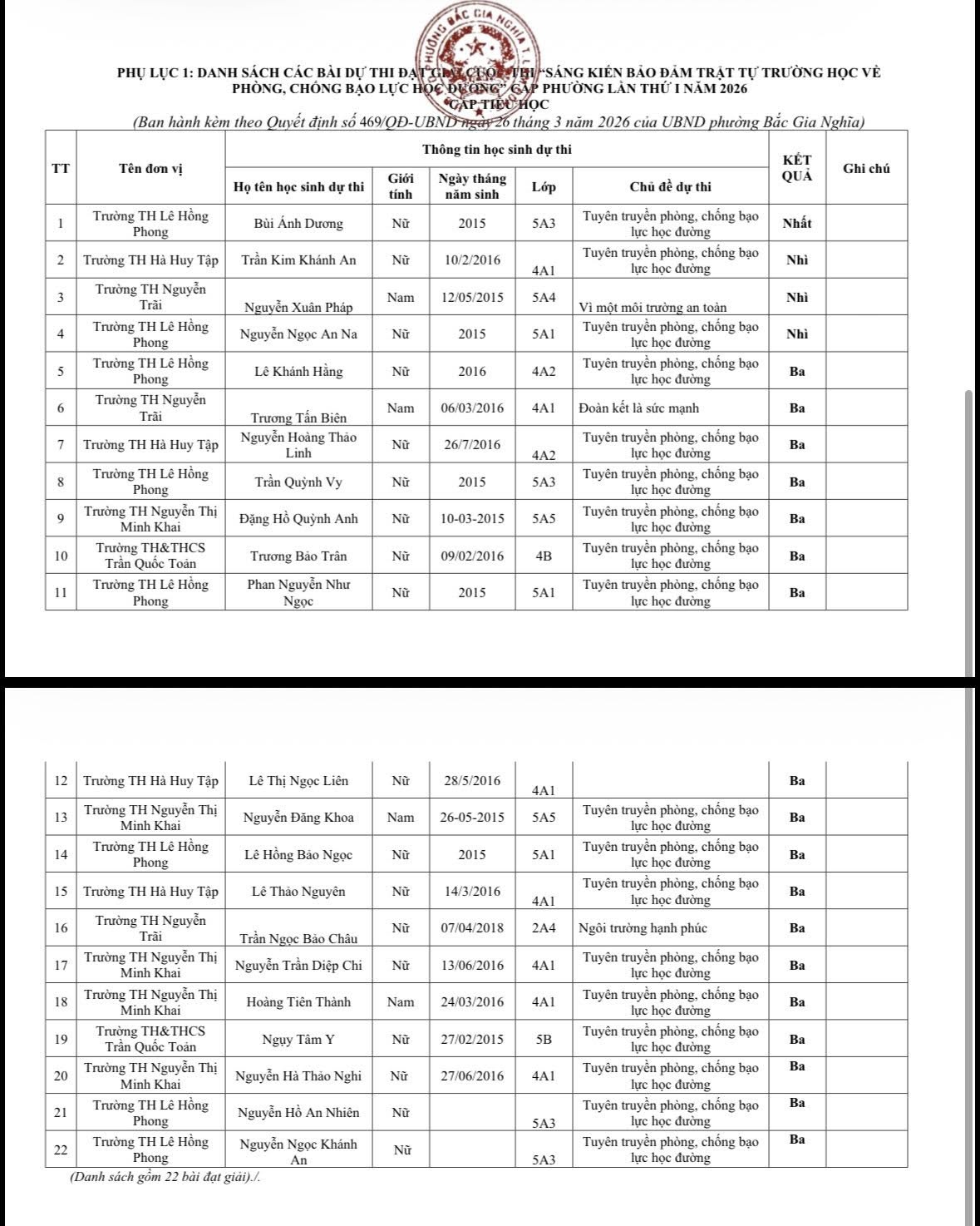 Học sinh trường Tiểu học Lê Hồng Phong, phường Bắc Gia Nghĩa tham gia cuộc thi “Sáng kiến bảo đảm trật tự trường học và phòng chống bạo lực học đường”, các em đã xuất sắc đạt được: